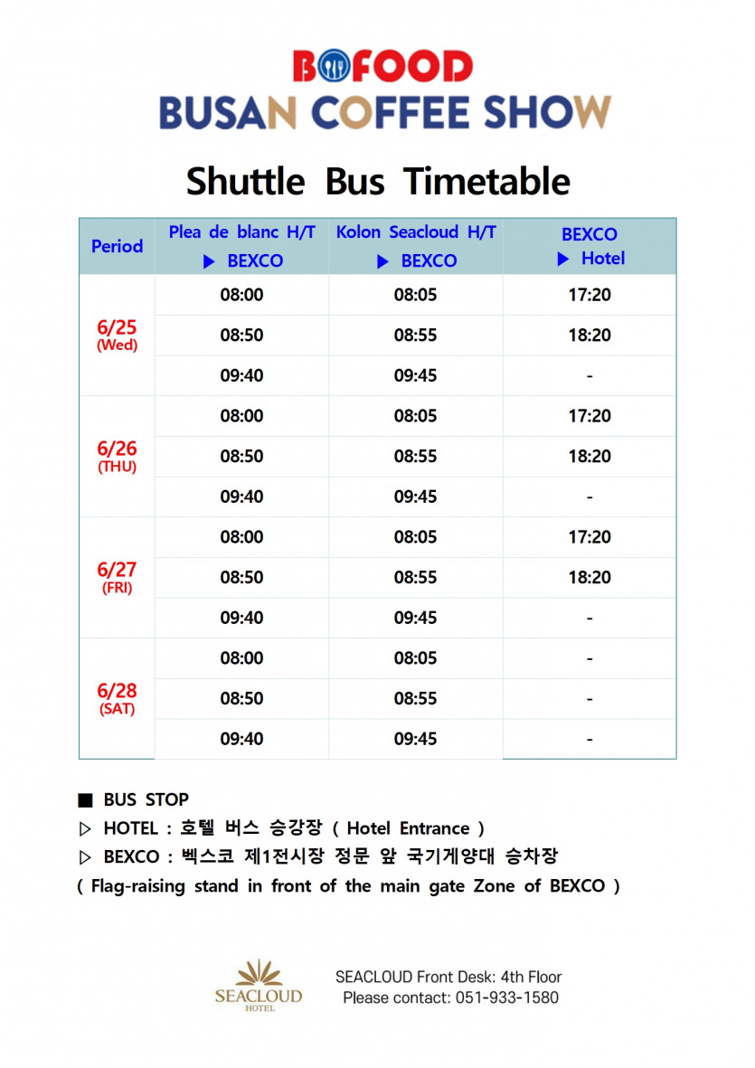 ★셔틀버스 시간표 페이지 정보 작성자관리자 조회 935회 작성일 25-06-16 19:18 본문 안녕하세요.부산국제식품대전 주최자 사무국입니다.아래와 같이 셔틀버스 시간표 안내드립니다.감사합니다. 목록
