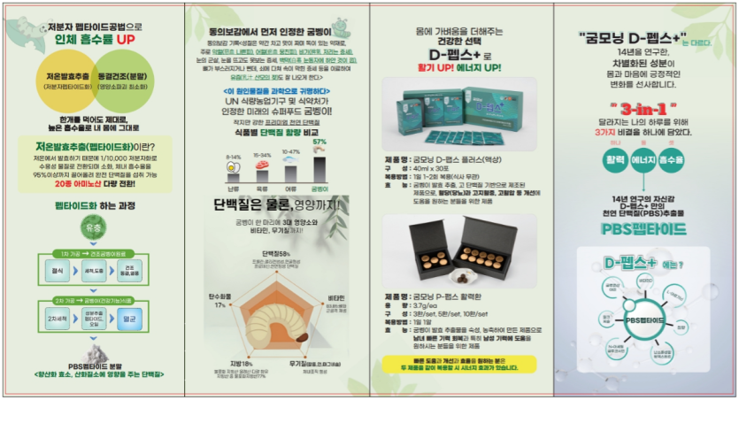 제조한 “단백질 분말 스틱”, “굼벵이 추출물 홍삼농축액”, “천연단백질 활력환” 등을 판매하고 있습니다.
